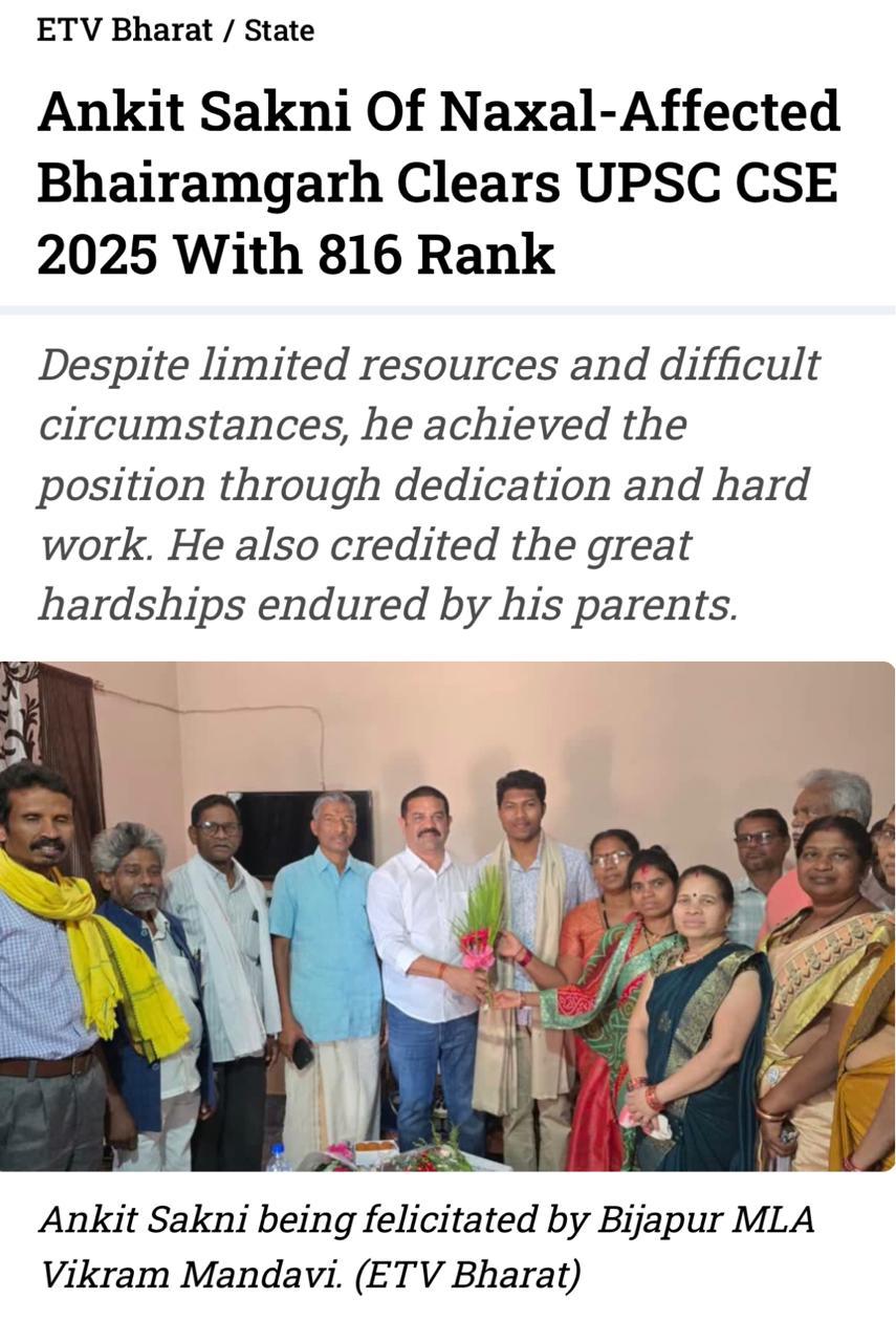 रायपुर, 8 मार्च 2026 : छत्तीसगढ़ के नक्सल प्रभावित क्षेत्र भैरमगढ़ के निवासी अंकित सकनी ने संघ लोक सेवा आयोग (यूपीएससी) सिविल सेवा परीक्षा 2025 में 816वीं रैंक प्राप्त कर क्षेत्र और राज्य का नाम रोशन किया है। सीमित संसाधनों और चुनौतीपूर्ण परिस्थितियों के बावजूद उन्होंने अपने परिश्रम, धैर्य और संकल्प के बल पर यह महत्वपूर्ण सफलता हासिल की।मुख्यमंत्री श्री विष्णुदेव साय, मंत्री श्री रामविचार नेताम और विभाग के प्रमुख सचिव श्री सोनमणि बोरा ने अंकित के इस सफलता के लिए बधाई और शुभकामनाएं दी हैं।