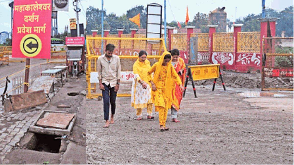 प्रवेश द्वार के मुहाने पर खुले पड़े चैंबर व नाले, मार्ग पर कीचड़ के कारण फिसल रहे श्रद्धालु।