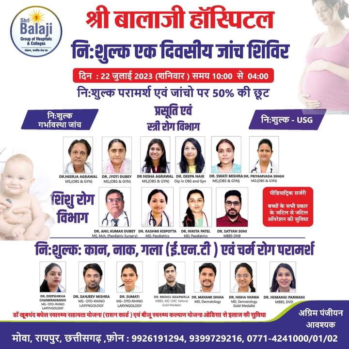 श्री बालाजी हॉस्पिटल मोवा द्वारा रायपुर में एक दिवसीय निःशुल्क जांच शिविर का आयोजन किया जा रहा है। जिसमें निःशुल्क यूएसजी , गर्भावस्था जांच कान ,नाक – गला और चर्म रोग के संबंध में निःशुल्क परामर्श और अन्य जांच पर 50 प्रतिशत छूट रहेगी। परन्तु 22 जुलाई को इस निःशुल्क जांच शिविर का लाभ उठाने के लिए अग्रिम पंजीयन करवाना अनिवार्य होगा।