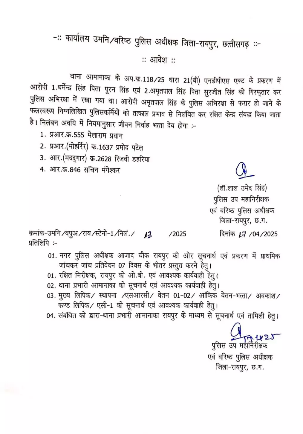 दरअसल, थाना आमानाका के अपराध क्र. 118-25 धारा 21 बी एनडीपीएस एक्ट के प्रकरण में आरोपी धर्मेंद्र सिंह पिता पूरन सिंह व अमृतपाल सिंह पिता सुरजीत सिंह को गिरफ्तार किया था। इस दौरान अमृतपाल सिंह पुलिस अभिरक्षा से फरार हो गया। इस गंभीर लापरवाही पर एसएसपी डाॅ लाल उमेद सिंह ने प्रआर मेलाराम प्रधान, प्रआर प्रमोद पटेल, आरक्षक रिजवी डहरिया, आरक्षक सचिन मंगेश्कर को निलंबित कर दिया है।